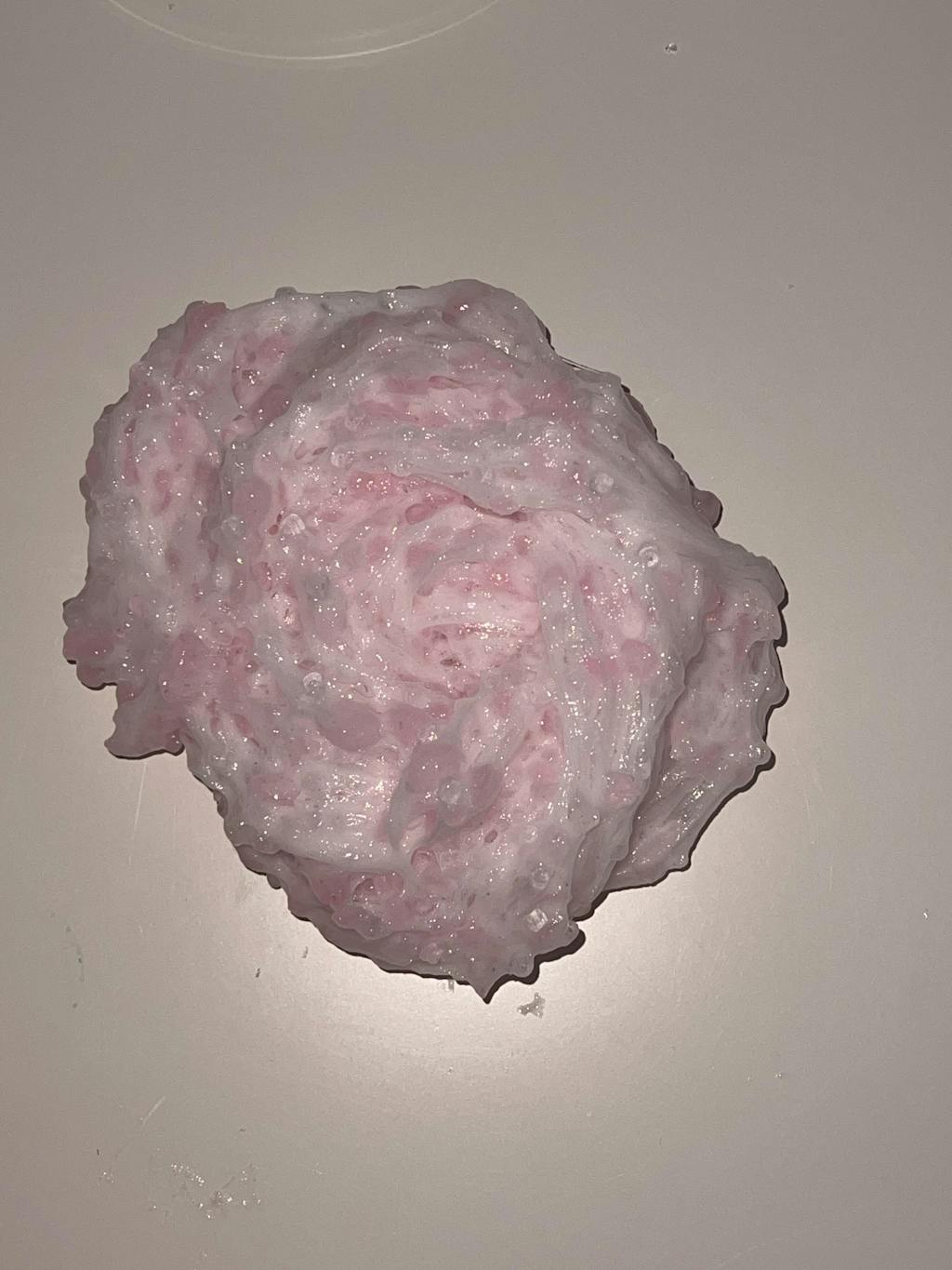 LOVE THIS SLIME!! i've been meaning to try out pss's white glue bingus after i bought a clear bingsu from another slime shop and learned i don't like clear slimes lol- and omg.. soo pretty, i love that when you mix in the clear slime it becomes this pastel, very light pink, and the shimmer is cute. i also love the add ins. it's super crunchy and makes great pops too. i'm unsure how i feel about the scent, but it's accurate so i can't complain too much. it's an amazing slime overall.